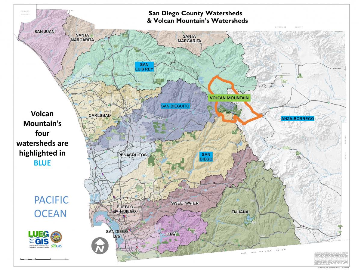 Volcan Mountain feeds four different watersheds in San Diego County. Water from Volcan flows into the San Luis Rey, San Dieguito and San Diego Rivers that run west all the way to the Pacific Ocean. On the east side of Volcan, San Felipe Creek flows east into the Anza-Borrego watershed.