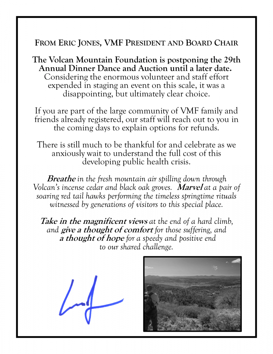 The Volcan Mountain Foundation is postponing the 29th Annual Dinner Dance and Auction until a later date. Considering the enormous volunteer and staff effort expended in staging an event on this scale, it was a disappointing, but ultimately clear choice.