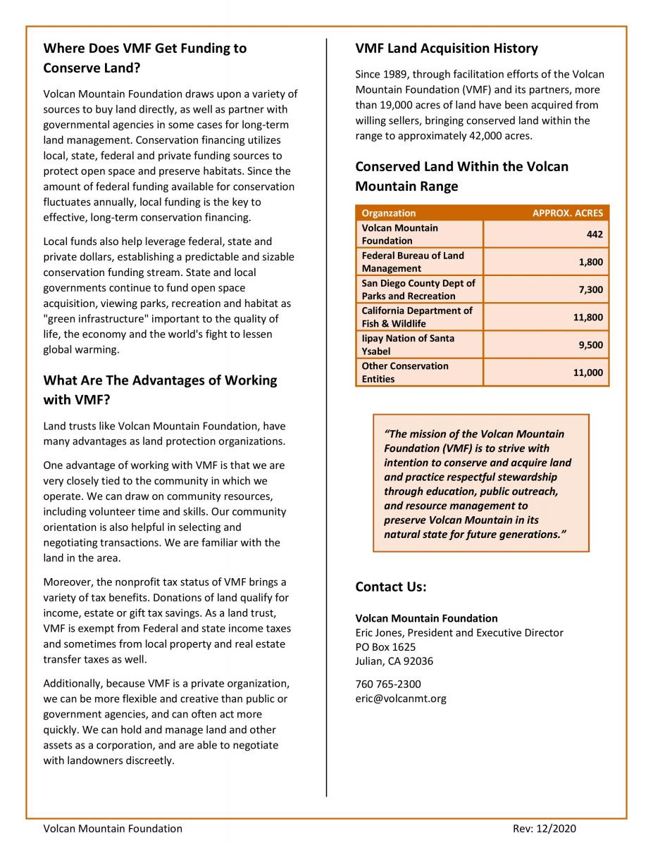 The Volcan Mountain Foundation respects private property rights and has pledged not to infringe upon those rights to implement its goals and objectives. Since 1989, through facilitation efforts of the Volcan Mountain Foundation and its partners, more than 19,000 acres of land have been acquired from willing sellers, bringing conserved land within the range to approximately 42,000 acres.