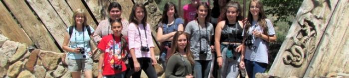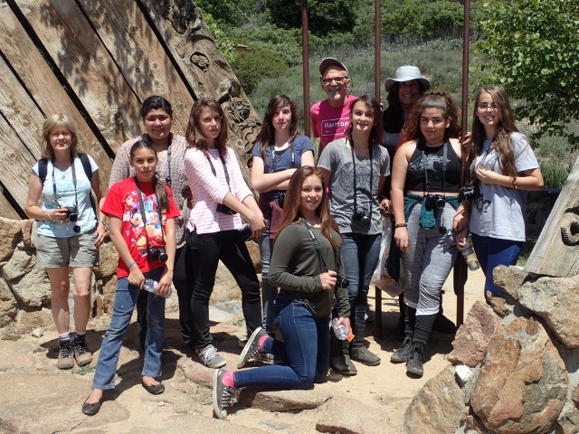 The Volcan Mountain Foundation's (VMF) popular Kids With Cameras (KWC) program is in the midst of its 2016 spring session. Partnering with Dana Pettersen of Julian Junior High's Club Timberwolf award-winning afterschool program, VMF's Jeff Holt and Janice Smith, along with parent, Dennis Cantor, led Jr. High students on an excursion to the Volcan Mountain Wilderness Preserve on May 4th. The remarkable artistry of the James Hubbell-designed gateway and kiva at the trail head along with an abundance of wildflowers like lupine and Indian paintbrush provided ample material for the young photographers.