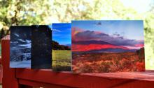 Four (two sets of two images) blank notecards. Fine art Graham Wilder photographs of a winter meadow and rocky outcropping on the Volcan Mountain range. Includes envelopes.