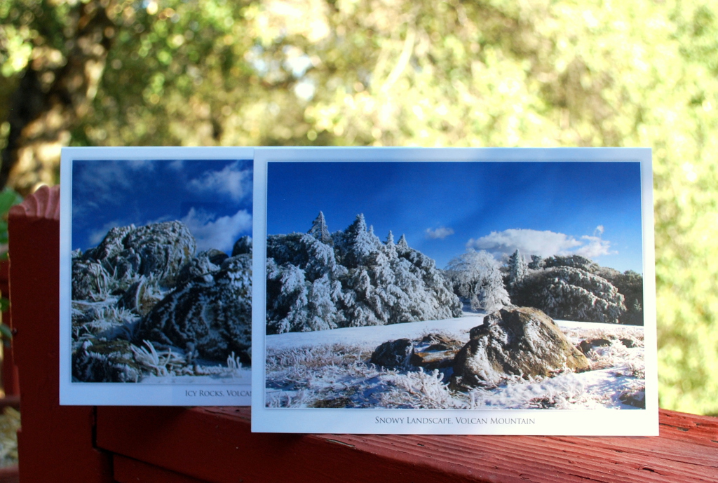 Four (two sets of two images) blank notecards. Fine art Graham Wilder photographs of a winter meadow and rocky outcropping on the Volcan Mountain range. Includes envelops.